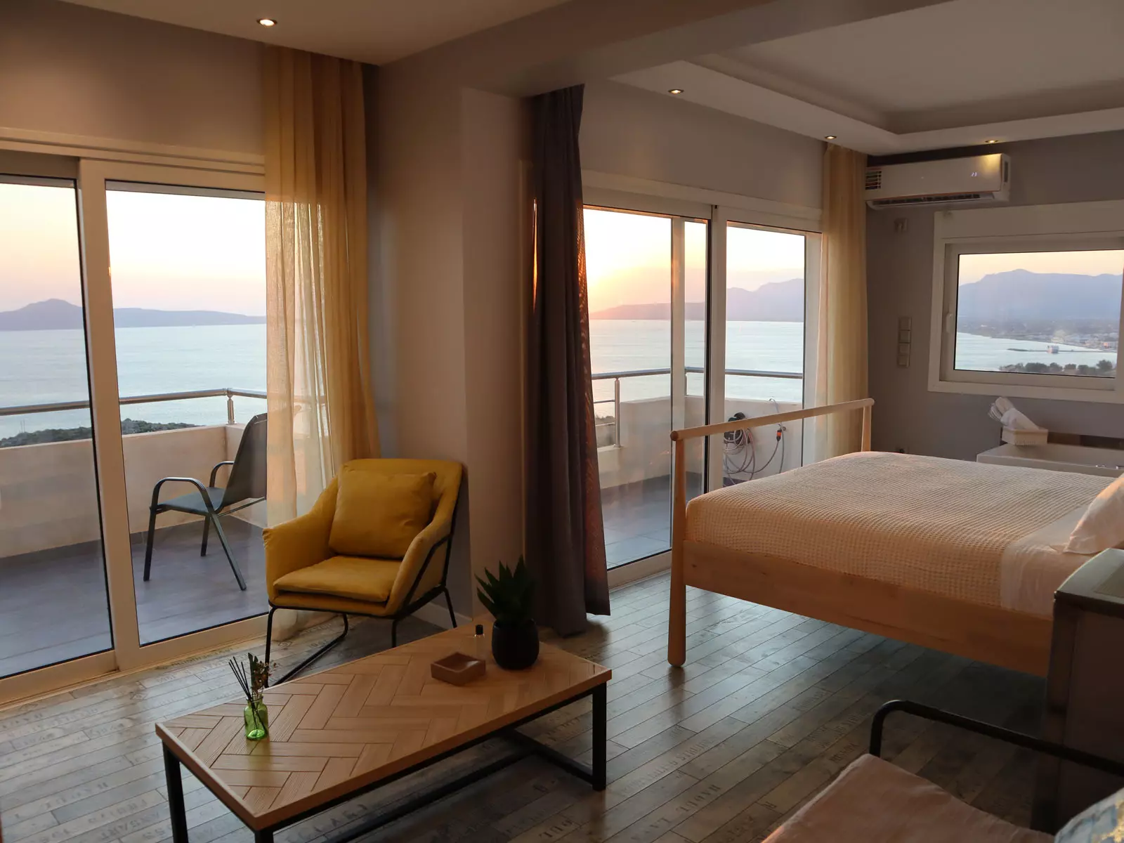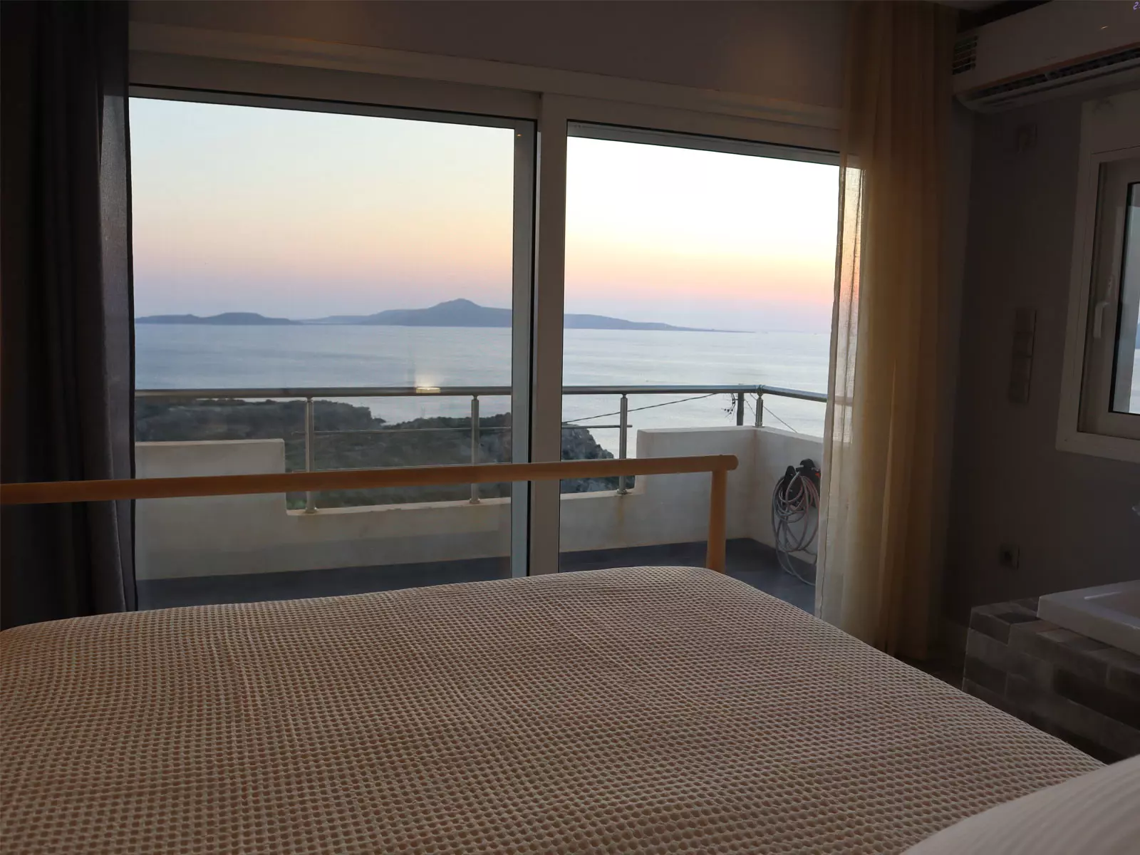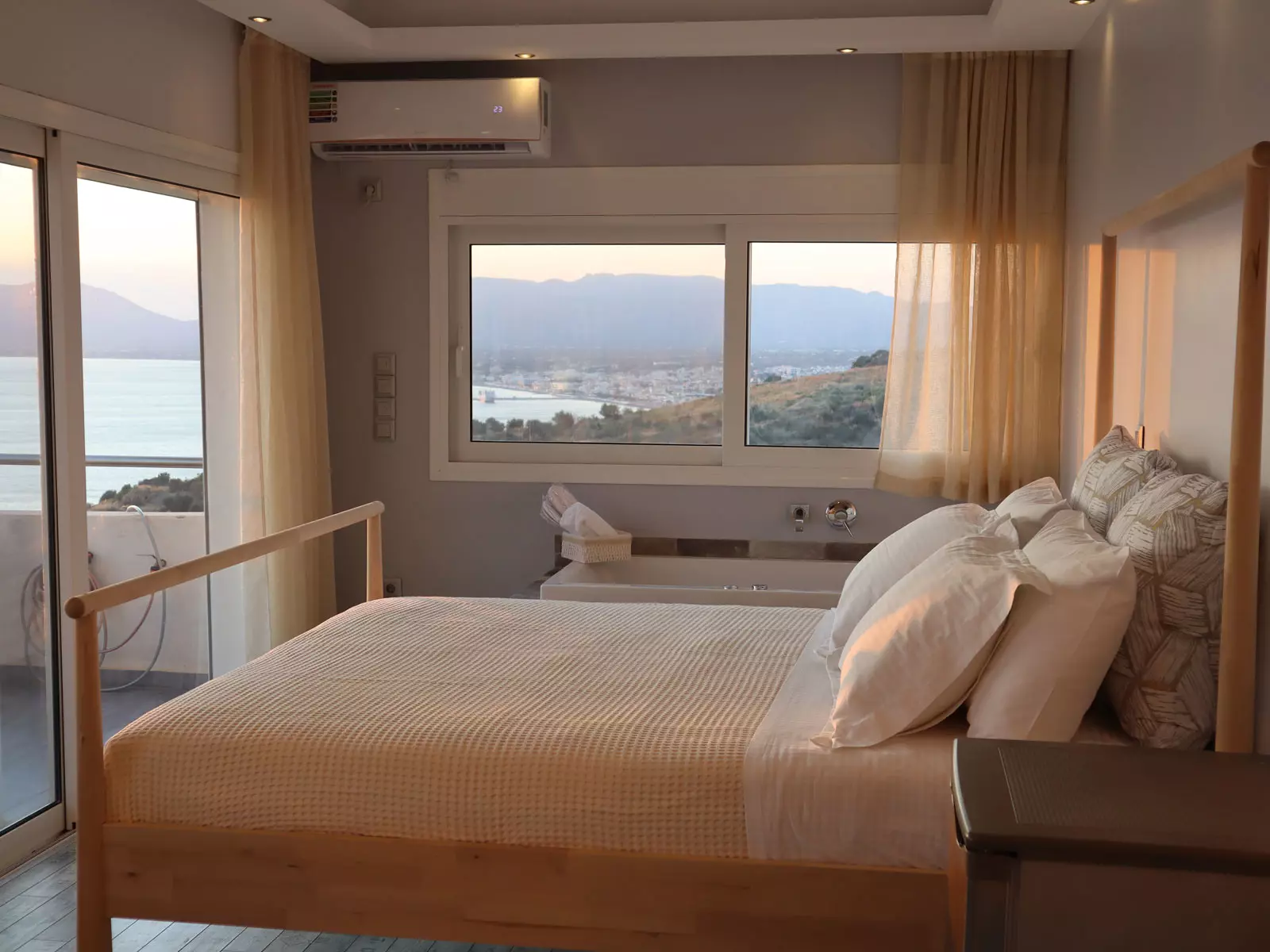 Νιώστε την άνεση του ύπνου που προσφέρουν τα στρώματα Cocomat και χαλαρώστε στο υδρομασάζ που βρίσκεται στο υπνοδωμάτιο με θέα στο απέραντο γαλάζιο.